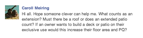 I do not agree with this at all. Why must the entire complex’s PQs be recalculated after one owner extends by a mere 10% or even the 15% stated above. What one owner does with his/her additional 10-15% extension has no bearing or influence on neighbouring units.